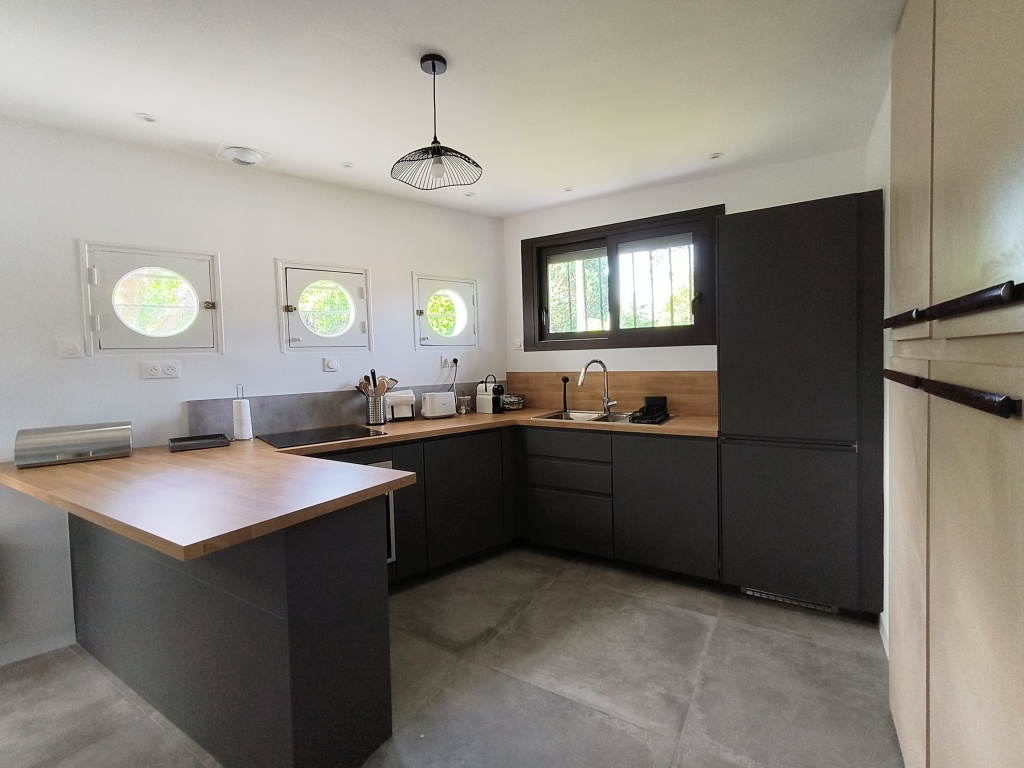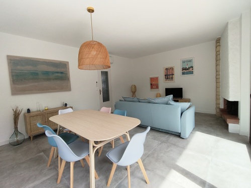 Idéalement placée grâce à sa proximité de la plage, à 100 m , du Bassin de baignade de Saint Brice et du sentier du littoral, jolie maison d'architecte avec une décoration soignée et de bon gout pouvant accueillir confortablement 5 personnes, elle se compose :